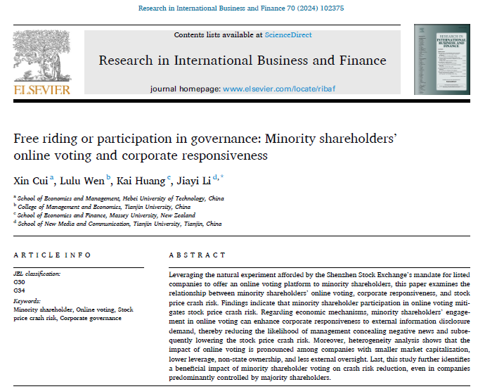 304永利集团官网入口崔欣博士(第一作者)撰写发表了有关中小股东积极主义对管理层行为及公司治理影响的文章。文章名为“Free riding or participation in governance: Minority shareholders’ online voting and corporate responsiveness”,刊发于Research in International Business and Finance。该期刊是SSCI一区期刊,ABS2级期刊,影响因子6.5,在JCR学科类别Business & Finance的111种期刊中排名第9。