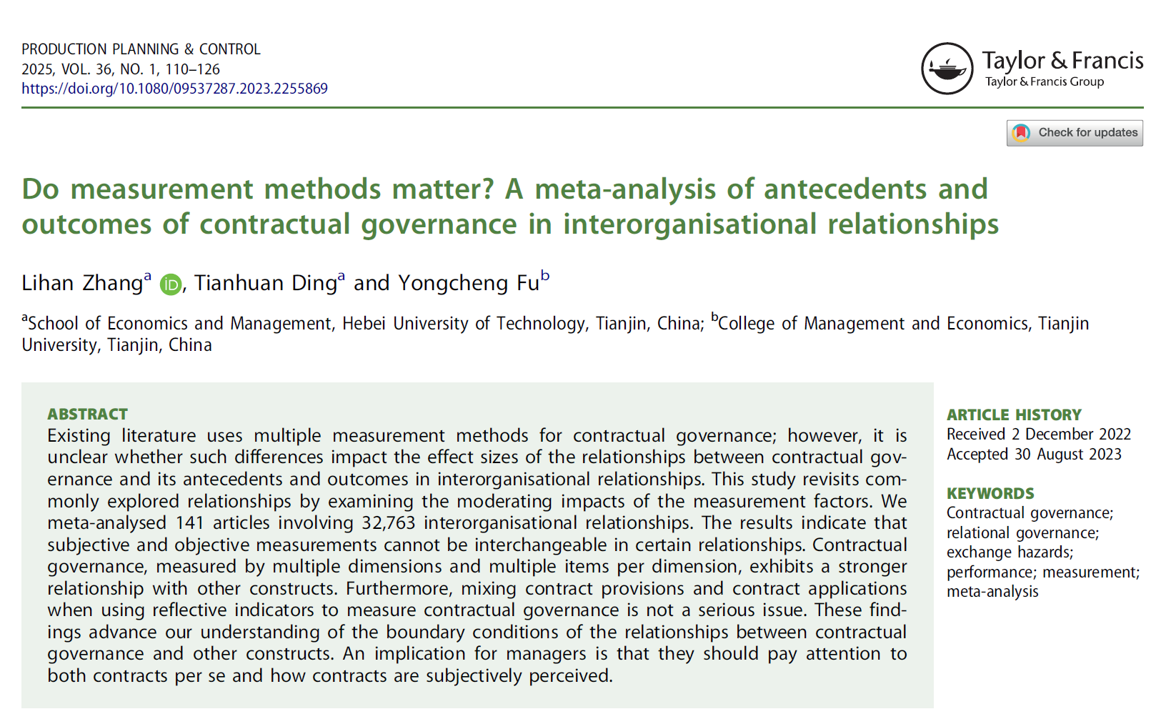 近日,304永利集团官网入口张丽晗博士(第一作者)撰写发表了有关合同治理测量方法差异的影响的文章。该文章采用元分析,探究了不同测量方法对合同治理与其相关变量之间关系的作用。文章名为“Do measurement methods matter? A meta-analysis of antecedents and outcomes of contractual governance in interorganisational relationships”,刊发在Production Planning & Control。该期刊是管理领域一流国际期刊,ABS3级,公司A1级期刊,影响因子6.1。