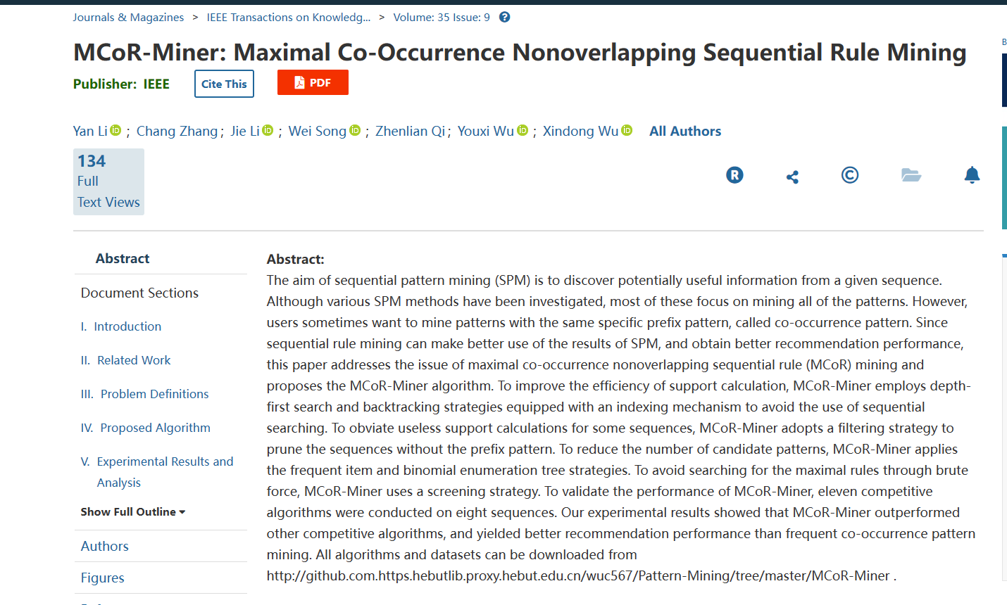 304永利集团官网入口李艳副教授(第一作者)撰写发表了关于挖掘最大共生无重叠序列规则的文章。文章提出了最大共生无重叠序列规则挖掘算法MCoR-Miner。该算法具有良好的推荐效果。文章名为“MCoR-Miner: Maximal Co-Occurrence Nonoverlapping Sequential Rule Mining”,刊发在IEEE Transactions on Knowledge and Data Engineering。该期刊是数据挖掘领域知名的国际顶级期刊,SCI一区期刊,影响因子8.9。