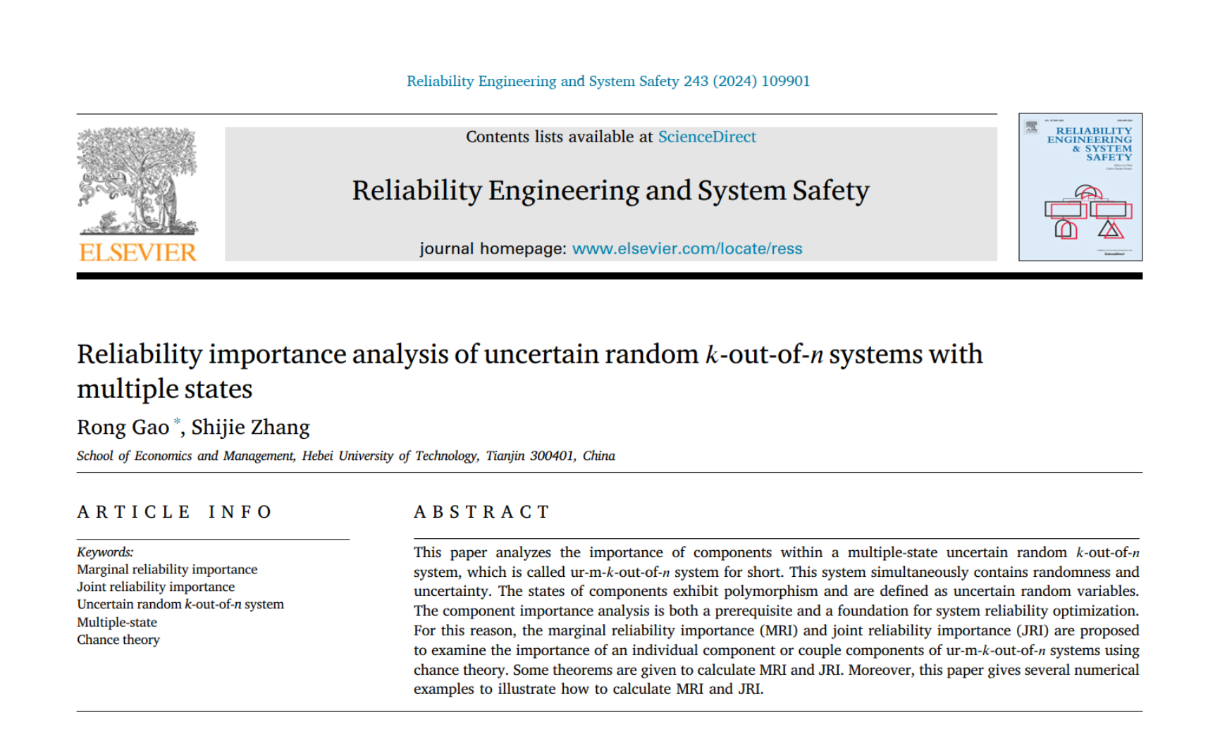 304永利集团官网入口高荣副教授(第一作者和通讯作者)撰写发表了有关多状态不确定随机k-out-of-n系统中元件重要度分析的文章。文章名为“Reliability importance analysis of uncertain random k-out-of-n systems with multiple states”,刊发在Reliability Engineering & System Safety。该期刊是SCI, JCR一区期刊,ABS三星,影响因子8.1。