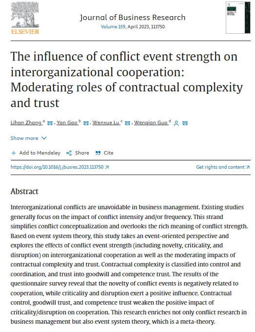 近日,304永利集团官网入口张丽晗博士(第一作者)撰写发表了冲突强度对组织间合作影响的文章,该文章扩展了冲突强度内涵,探究了合同复杂性与信任对冲突强度效果的调节作用。文章名为“The influence of conflict event strength on interorganizational cooperation: Moderating roles of contractual complexity and trust”,刊发在Journal of Business Research。该期刊是商业管理领域一流国际期刊,SSCI二区TOP期刊,影响因子11.3。