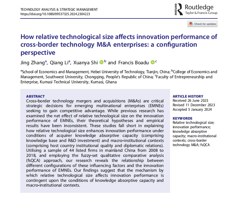304永利集团官网入口张敬教授撰写并发表了关于相对技术规模如何影响跨境技术并购企业的创新绩效的研究。文章名为“How relative technological size affects innovation performance of cross-border technology M&A enterprises:a configuration perspective”,刊发在《Technology Analysis & Strategic Management》。该期刊是SSCI,JCR二区期刊,ABS 2级期刊,影响因子2.9。