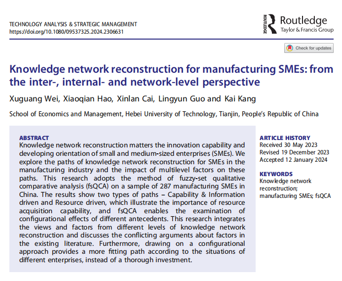 304永利集团官网入口魏旭光副教授(第一作者)撰写发表了关于探索中小制造企业知识网络重构路径的文章。文章名为“Knowledge network reconstruction for manufacturing SMEs: from the inter-, internal- and network-level perspective”,刊发在Technology Analysis & Strategic Management。该期刊是SSCI,JCR三区期刊。
